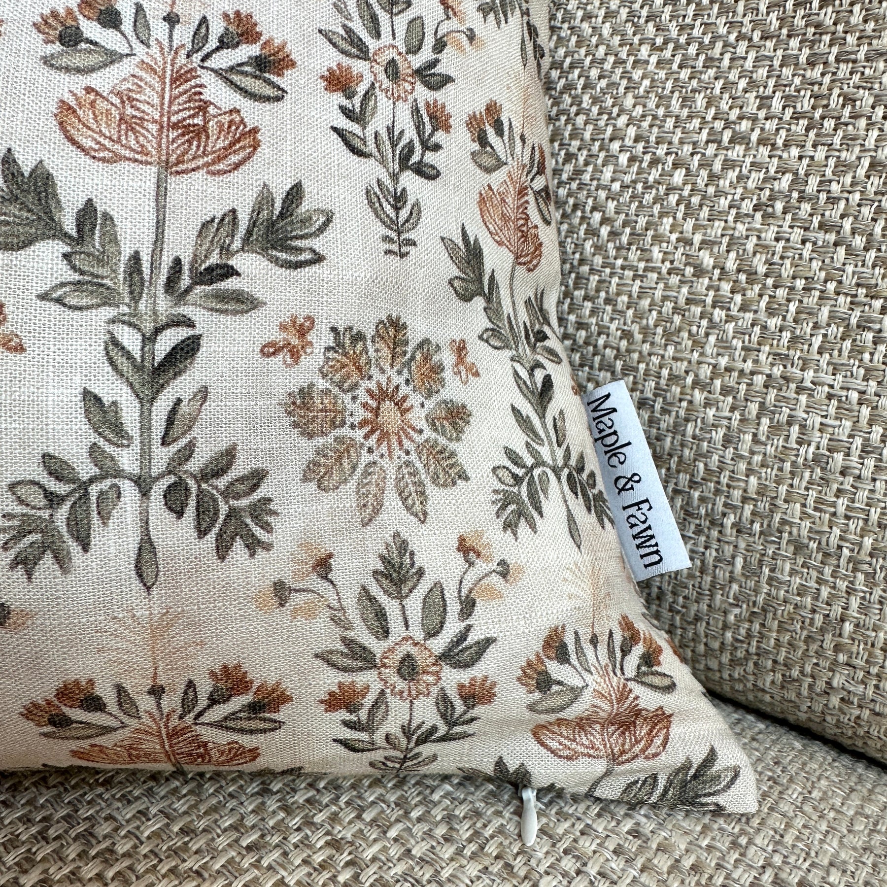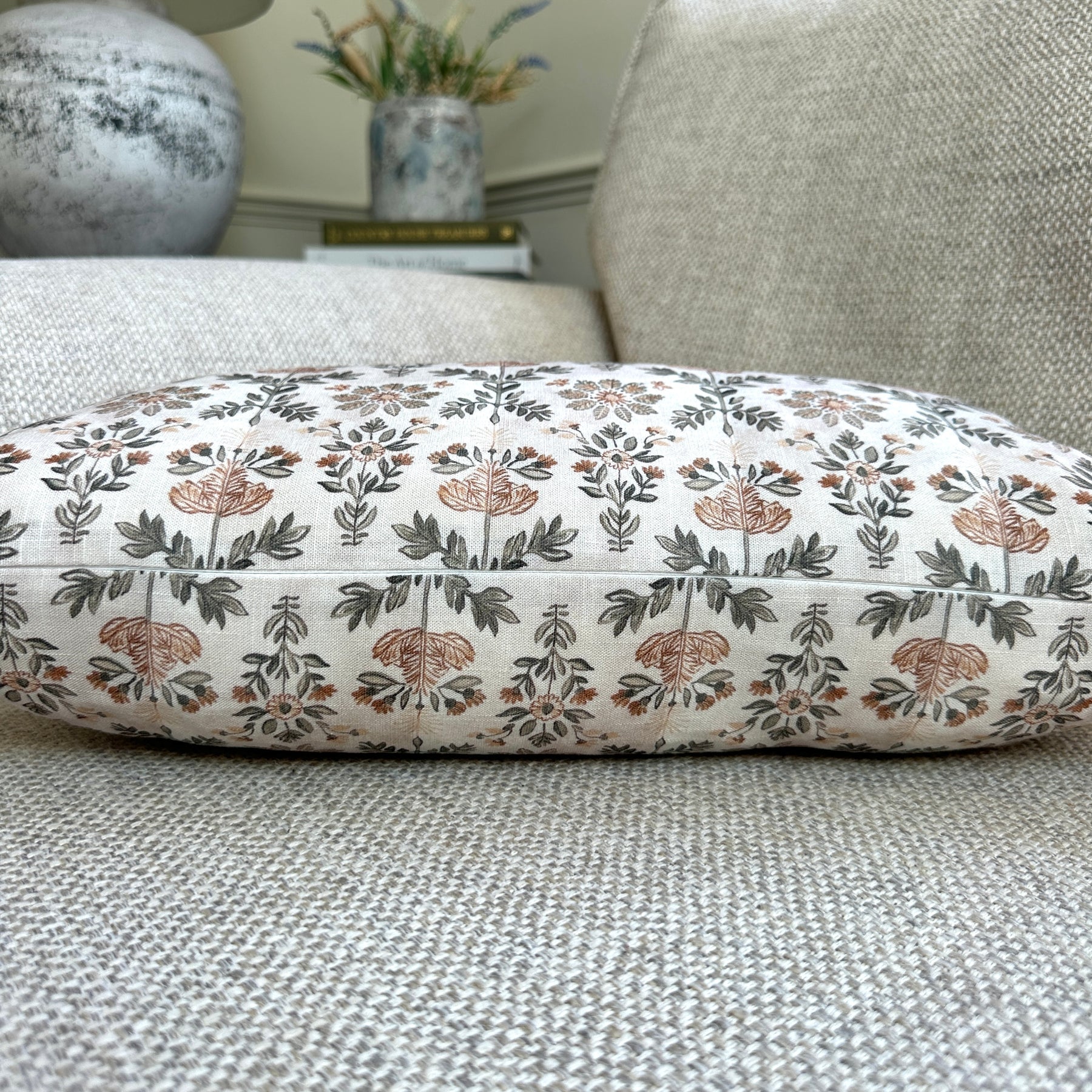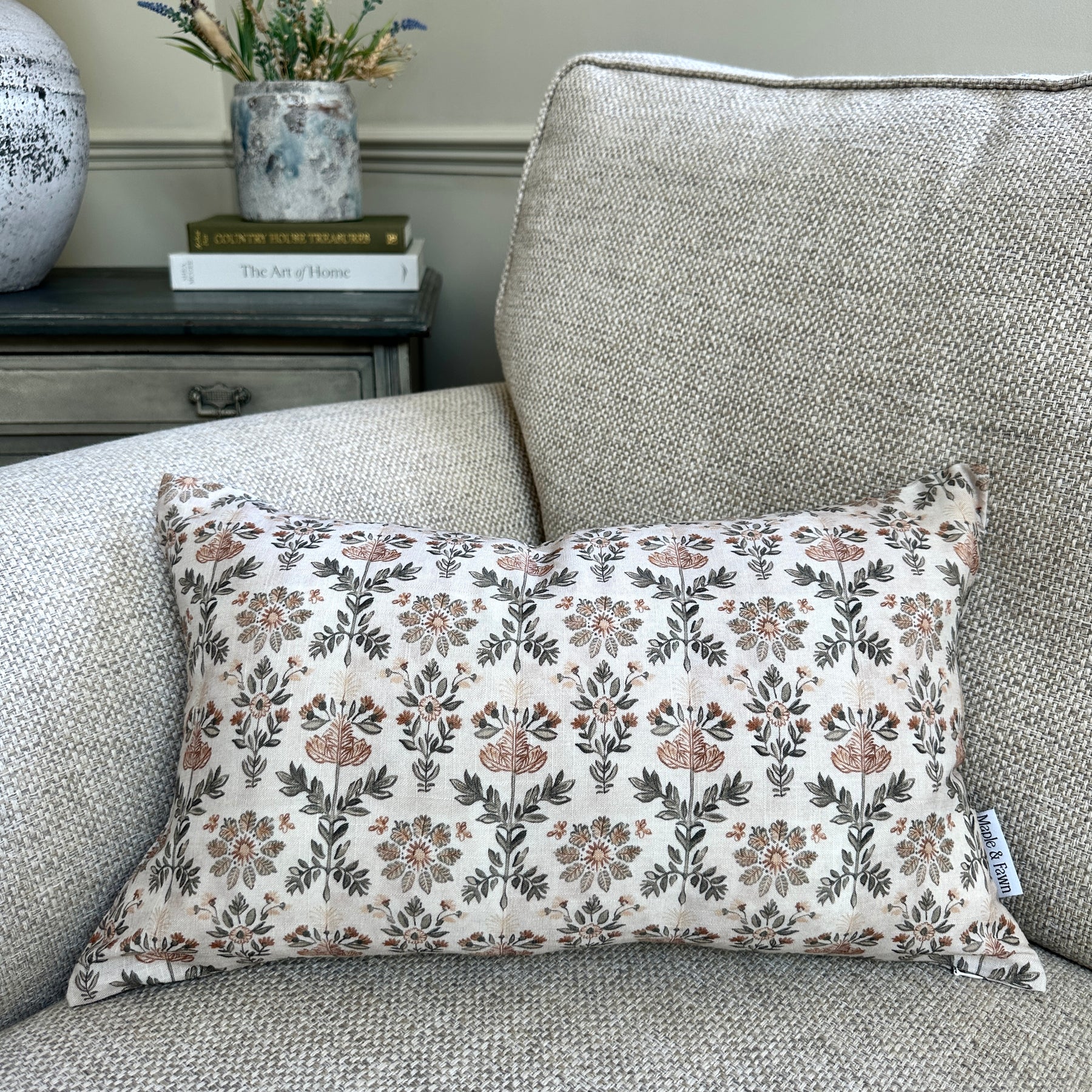 Regular price £21.95This pretty rectangular cushion features a delicate floral pattern in warm brown and muted green tones on a neutral base, adding subtle detail while remaining easy to style.