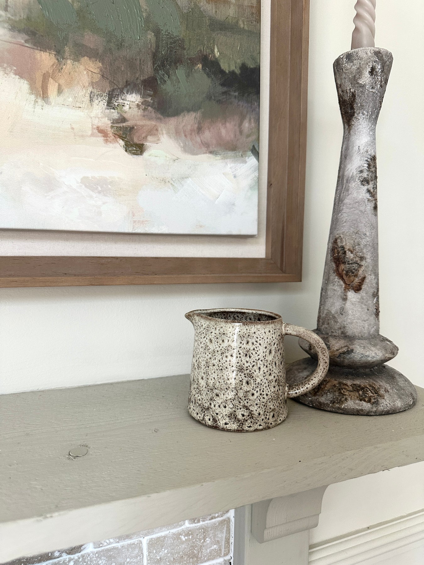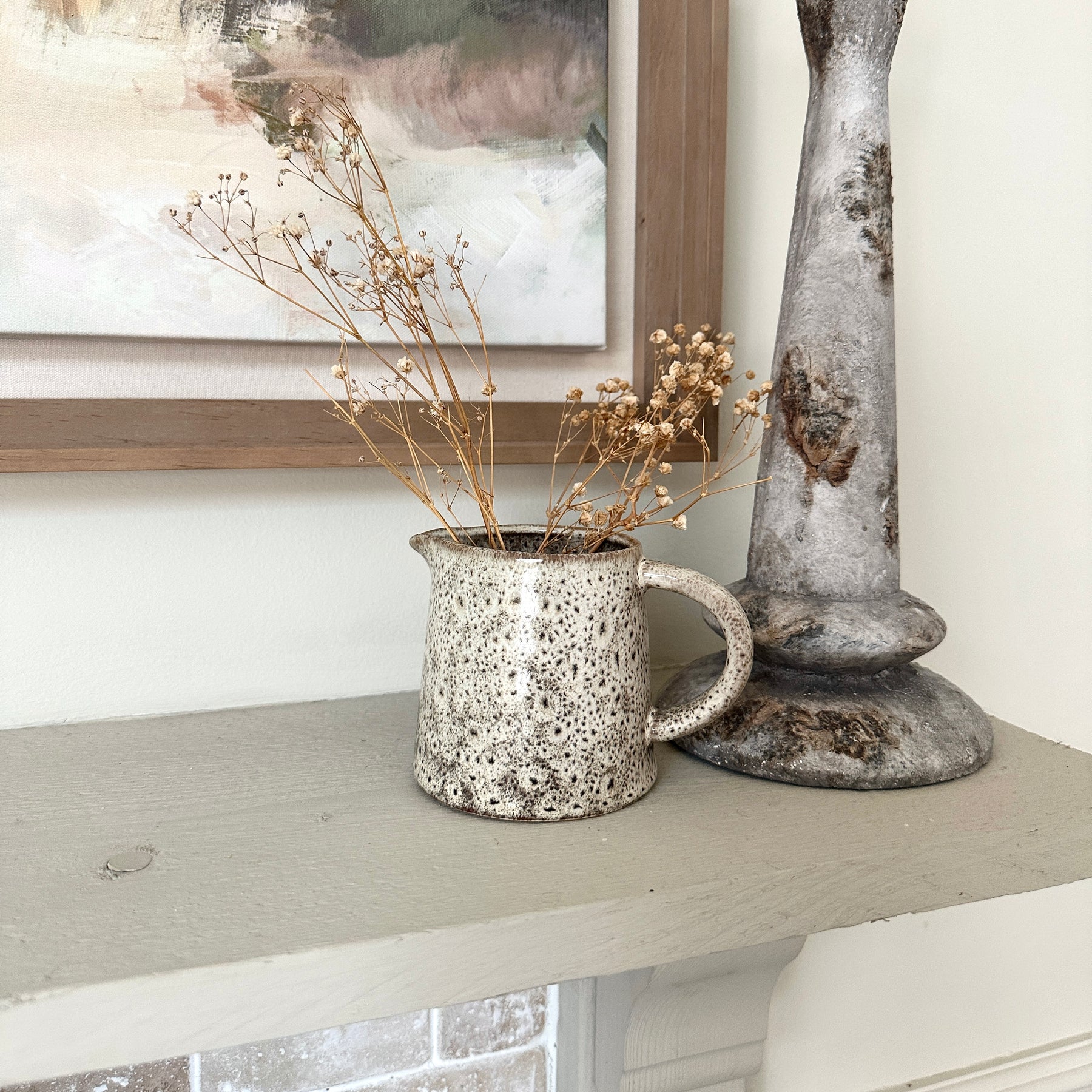 Regular price £16.95A small stoneware jug in a soft warm neutral with a subtle speckled finish. Perfect for styling on a coffee table, shelf or bedside, with or without stems.